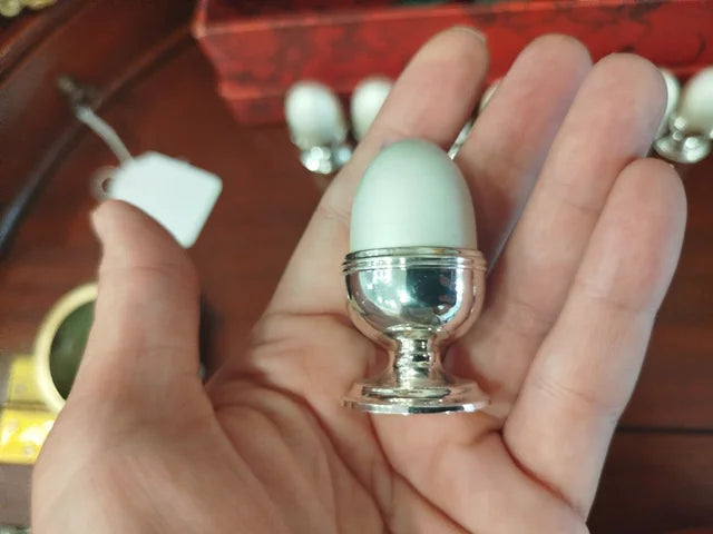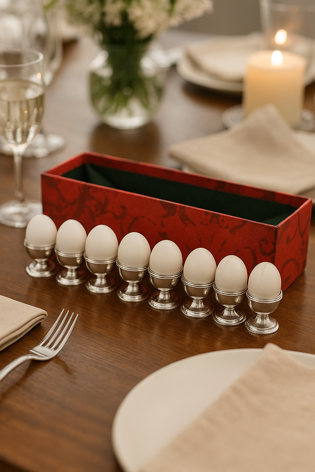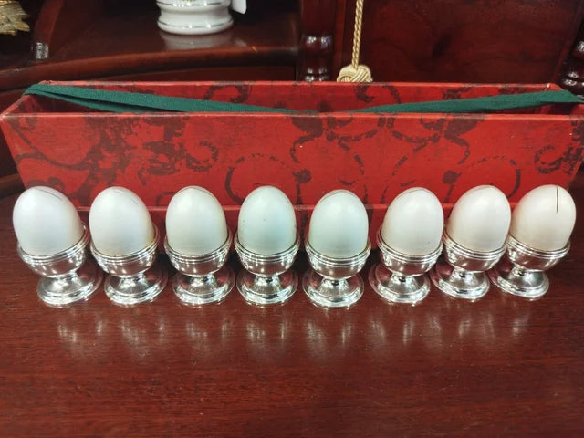 Conjunto de 8 huevos tarjeteros con peana de alpaca, ideales para identificar a los comensales en sus asientos asignados con estuche rojo incluido.