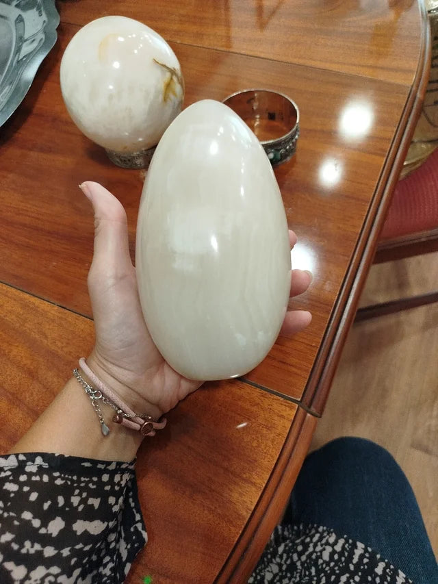 Set decorativo compuesto por una esfera y un huevo en mármol o material similar. Cada pieza se eleva sobre una base de metal labrado con detalles ornamentales. El contraste entre la solidez del alabastro y el trabajo fino del metal crea una pieza sofisticada, con presencia y misterio.