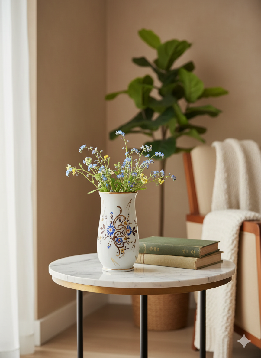 Elegante jarrón de porcelana con un diseño floral pintado a mano. El borde superior y la base están realzados con un delicado acabado dorado, aportando un toque de distinción.