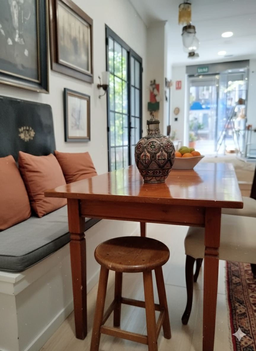 Elegante jarrón decorativo con un diseño detallado y sofisticado. Cuenta con una base de cerámica decorada a mano y un revestimiento metálico con patrones ornamentales. Su acabado combina tonos vibrantes con plateados, ofreciendo una estética multicolor atractiva.